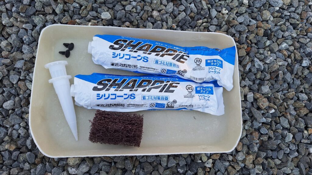 次に、補修用のFRP皿の裏面と、消毒槽の底部にシリコーンを塗り付けます。
